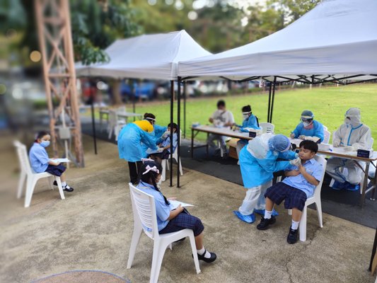 นักเรียนที่มาเรียนในรูปแบบ On site ทุกคนตรวจ ATK โดยหน่วยตรวจวิเคราะห์คัดกรองเชื้อโควิดเคลื่อนที่เส้นด้าย